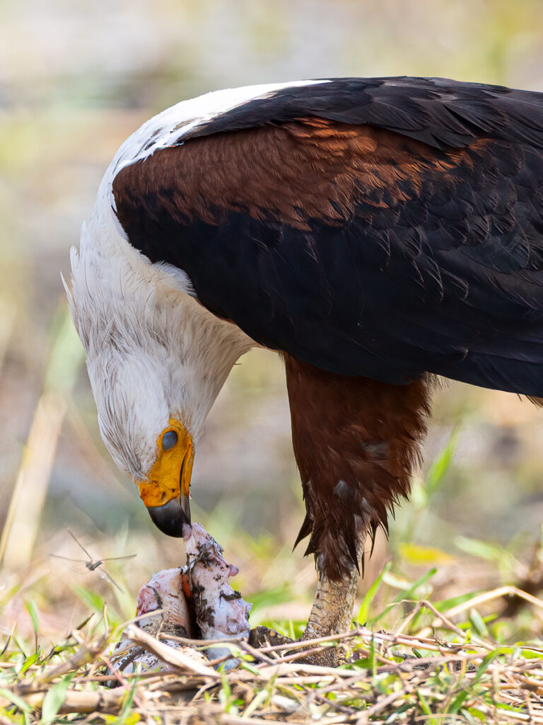 African Fish Eagle protects their eyes while feeding. Photographed in Akagera NP, Rwanda.