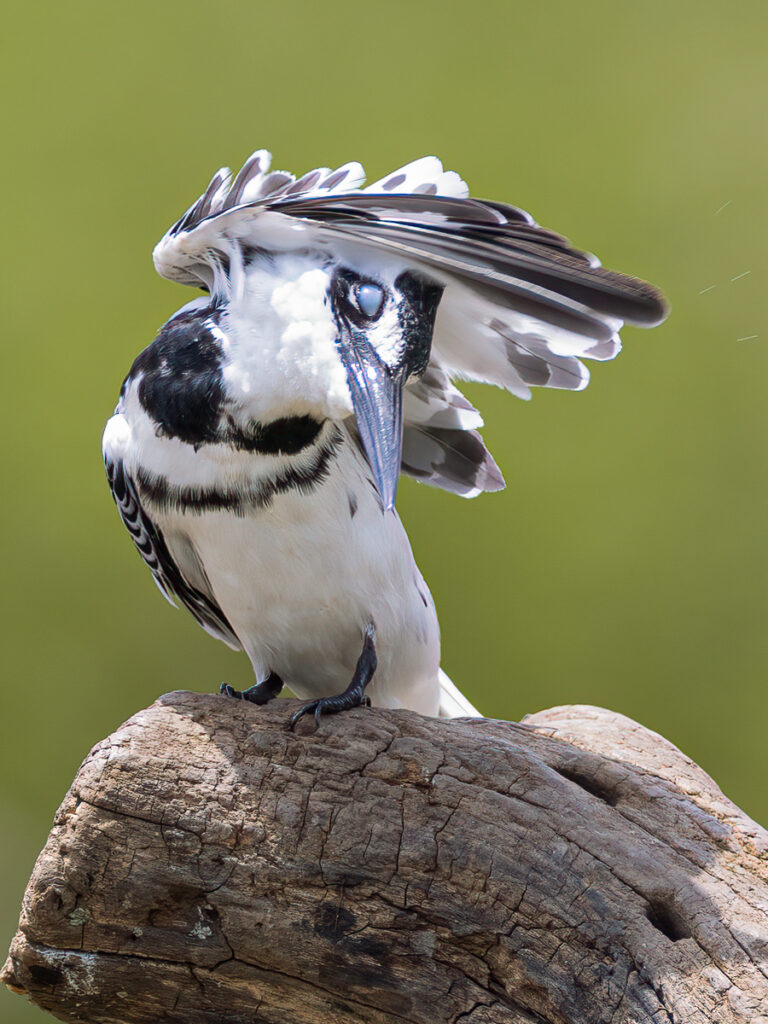 Male Pied Kingfisher preening – nictitating membrane protects against wayward feathers and movement. Photographed in Kigali, Rwanda.