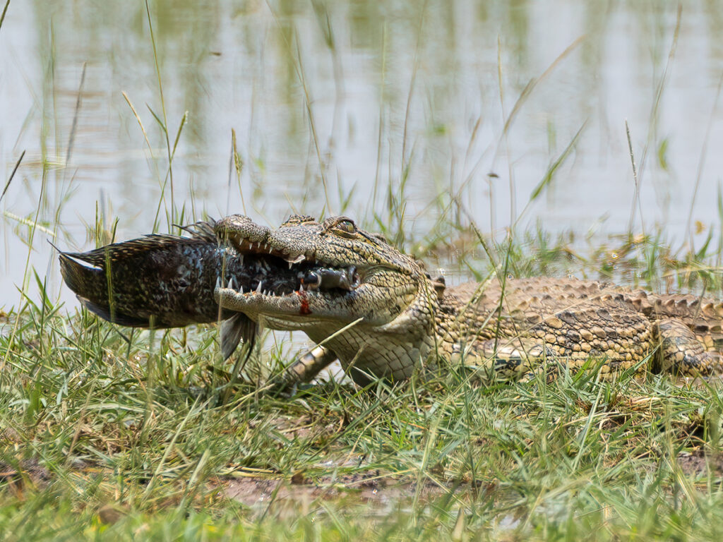 Nile Crocodile with their catch – note the nictitating membrane drawn across a portion of the eye, photographed in Akagera NP, Rwanda.