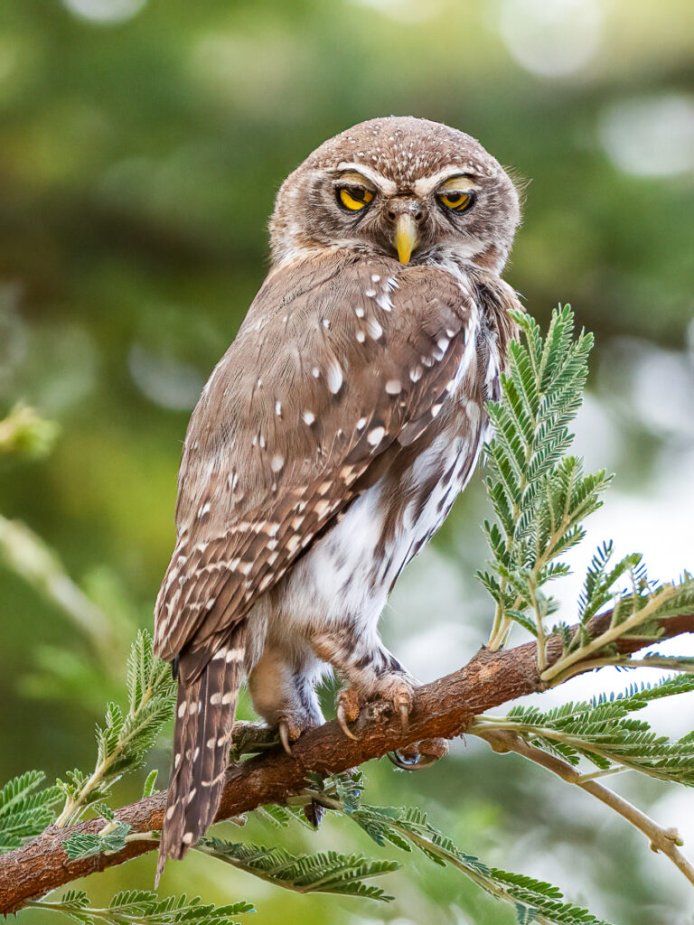 Pearl-spotted Owlet – note the darker edges of the membrane across the bright yellow iris. Photographed in Akagera NP, Rwanda.